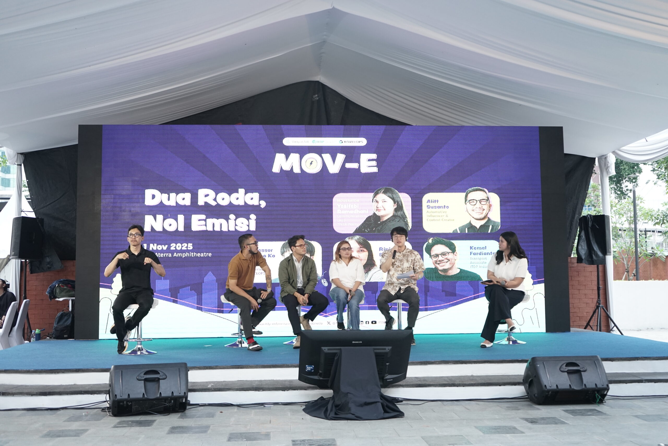 MOV-E featured two talkshow sessions focusing on electrification from the perspectives of two-wheeler vehicles and urban public transport. The first session, “Two Wheelers, Zero Emissions,” was moderated by Yosifebi Ramadhani from Think Policy and featured speakers including Alitt Susanto, Content Creator; Riniwaty Sinaga, Public Relations, Indonesian Electric Motorcycle Industry Association (AISMOLI); Professor Joonho Ko, Advisor at Hanyang University/ENVELOPS; and Kemal Fardianto, Transport Associate ITDP Indonesia.
