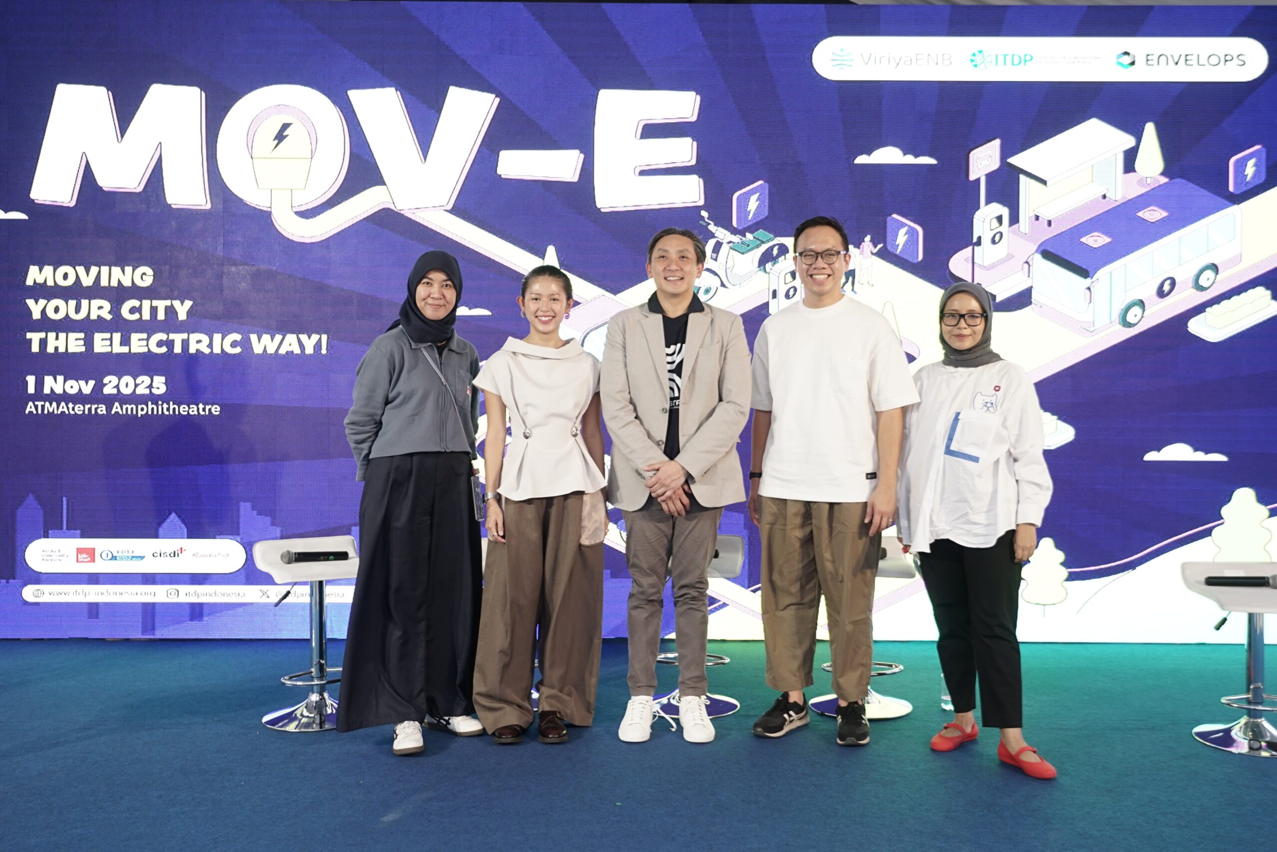 ITDP Indonesia, along with ViriyaENB and ENVELOPS Co., Ltd., organized a public outreach event titled “MOV-E: Moving Cities the Electric Way” on 1 November 2025 at the ATMAterra Amphitheatre, Atma Jaya Catholic University, Semanggi. The event served as a collaborative platform for various stakeholders to raise public awareness, understanding, and participation in accelerating the transition to a low emission mobility system.