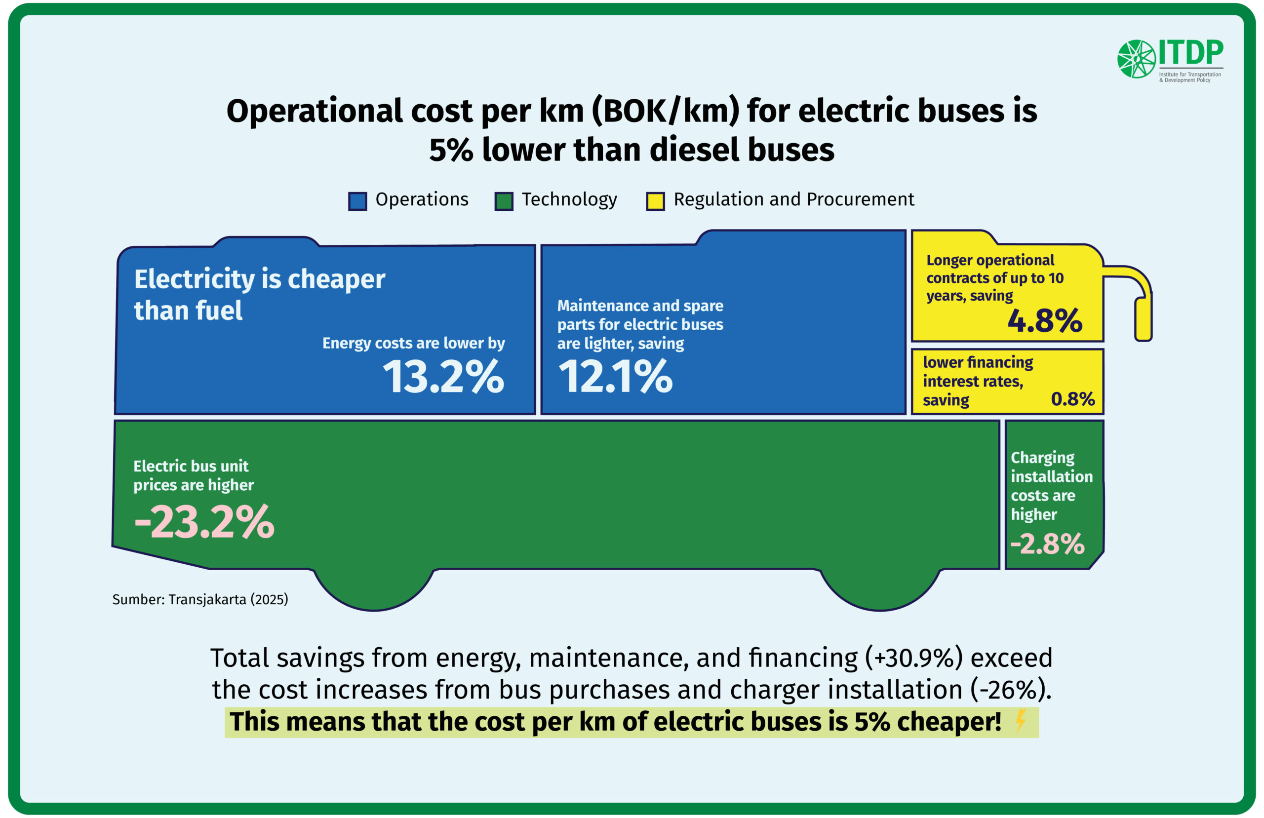 Lessons from Transjakarta show that by 2024, the Operating Cost per Kilometre of its electric buses was already about 5% lower than that of conventional fossil-fuel buses, in line with ITDP’s 2022 projections8. In line with this, operational data from EVs operated by PT Kalista Nusa Armada (KALISTA) in Medan, for example, shows a potential energy cost savings of up to 79%9.