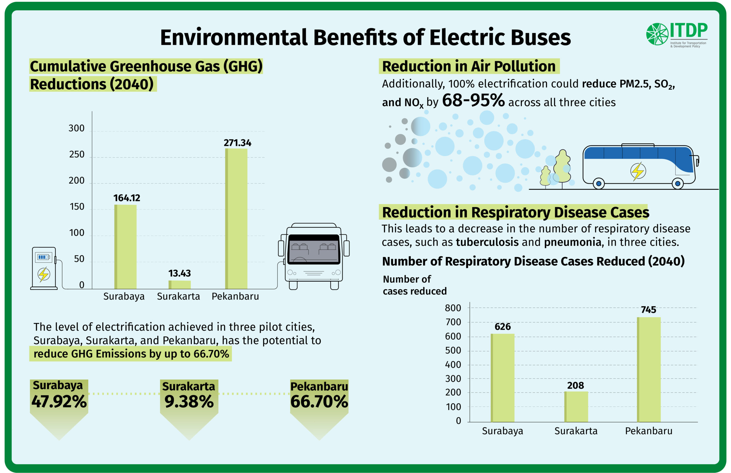 From an environmental perspective, electrifying urban bus fleets has a significant impact. According to ITDP’s study on public transport electrification in Jakarta, city buses account for around 45.7% of transport sector greenhouse gas emissions and 21.4% of local air pollution. With the gradual electrification of Transjakarta, potential greenhouse gas reductions are estimated at around 611,580 tCO₂e by 203010. This reduction translates into lower pollution-related health risks and long-term savings in healthcare costs.