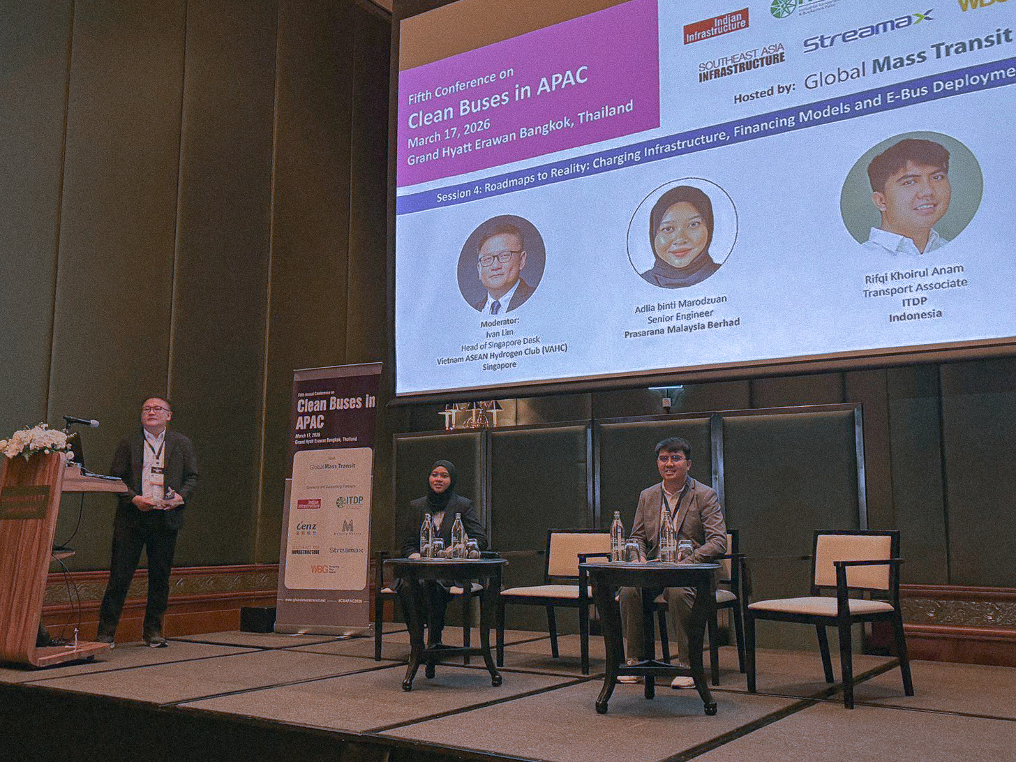 Rifqi Khoirul Anam, Transport Associate at ITDP Indonesia, was featured as a speaker in the fourth session of “Clean Buses in APAC,” titled “Roadmaps to Reality: Charging Infrastructure, Financing Models, and E-Bus Deployment,” held in Bangkok on March 17. The session brought together government officials, public transport authorities, operators, bus manufacturers, consultants, and academics all across the Asia Pacific.
